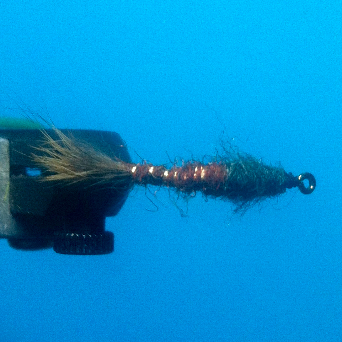 The easiest pattern of the bunch to tie because there is no wing case and no legs. I didn't have natural red squirrel fur, so I substituted some rust color "Squirrel Brite" dubbing, that I already had on hand, for the abdomen. Feel free to substitute any shade you wish. The contrasting shades and the sparkle of the tinsel rib should get the attention of the trout.